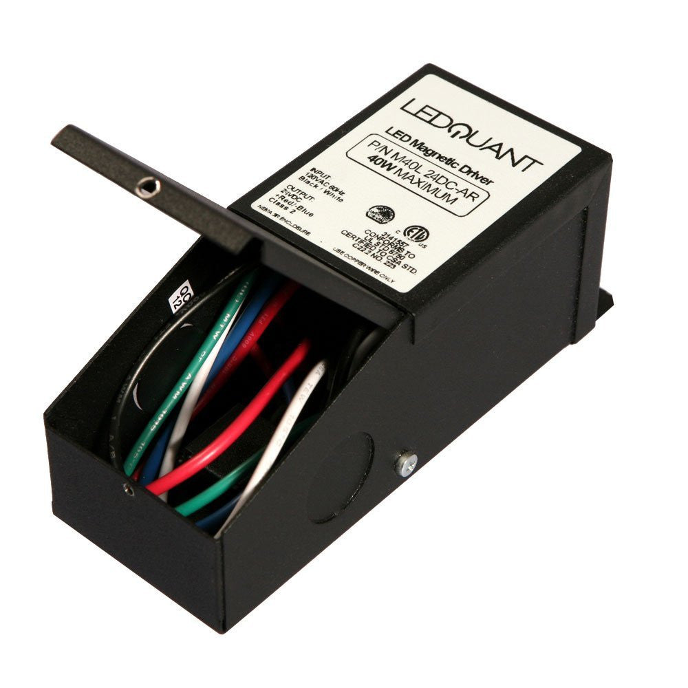 LEDQuant's M24V-40W-DC is one of the most compact LED drivers on the market with a magnetic transformer core. It is equipped with auto-reset breakers, one on the input and one on the output, which protect both the load and driver. The driver is encased in a coated metal box that includes 2 knock-outs on the bottom to enable easy installation that complies with electrical code requirements.
